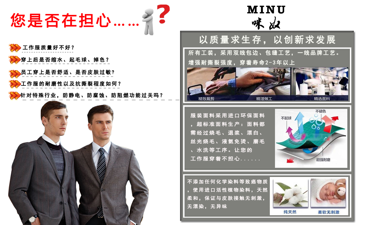 一家集設計,制版,生產(chǎn),銷售為一體服裝企業(yè)。公司制服部專業(yè)為企業(yè)團體“量身訂做”各種制服、工作服、廠服等。公司建立了完善的專業(yè)化、一體化的企業(yè)服務體系。本著“以質(zhì)量求生存,以創(chuàng)新求發(fā)展”管理理念,重視觀念更新,全面引進最新電腦設備及先進縫紉技術,加強高工藝培訓,由技術精湛、經(jīng)驗豐富的設計師及工藝師們組成的設計部,可根據(jù)客戶的企業(yè)文化氛圍、經(jīng)營風格和理念等特殊需求進行全新的富有獨特創(chuàng)意的設計和制作。